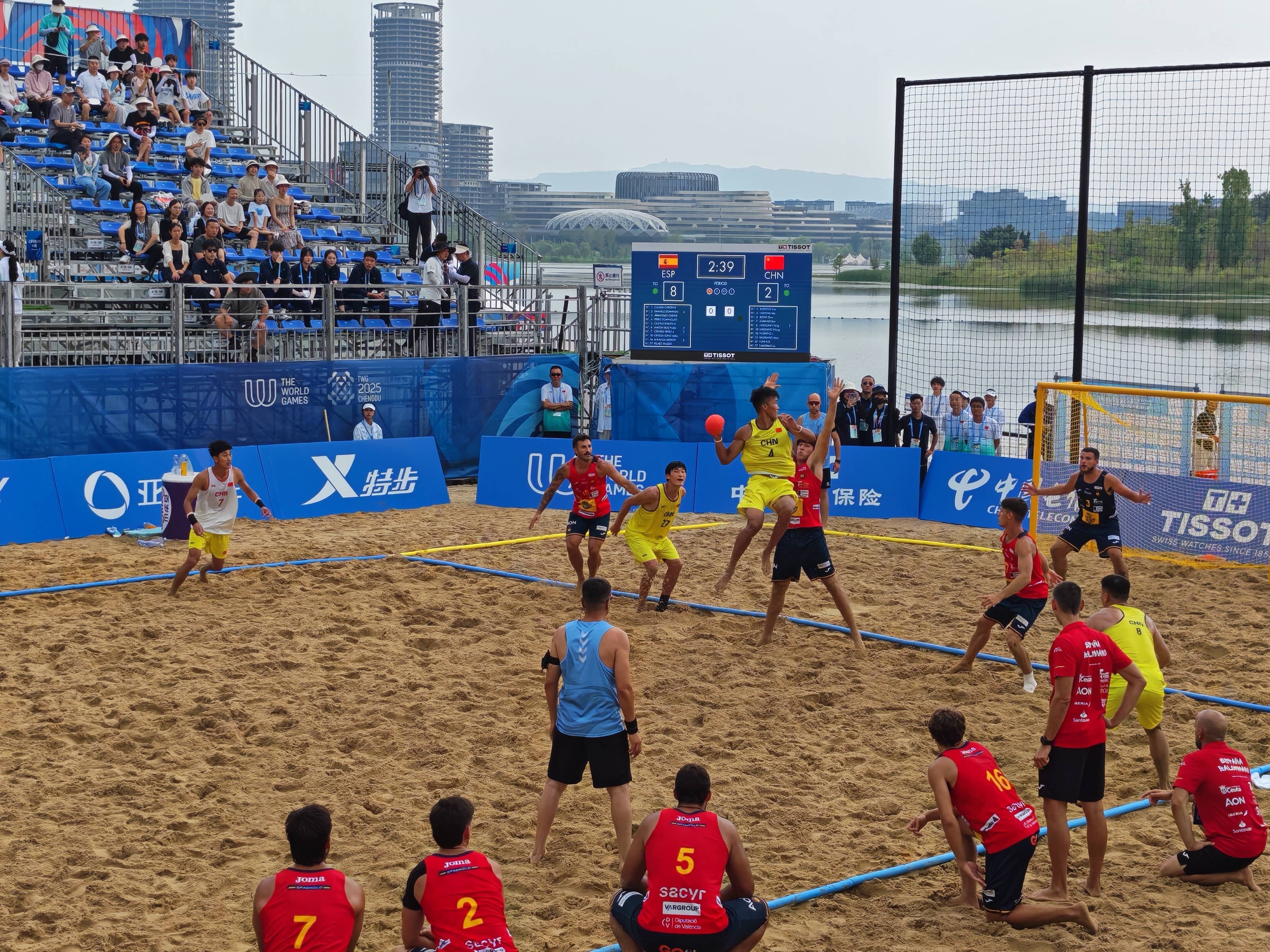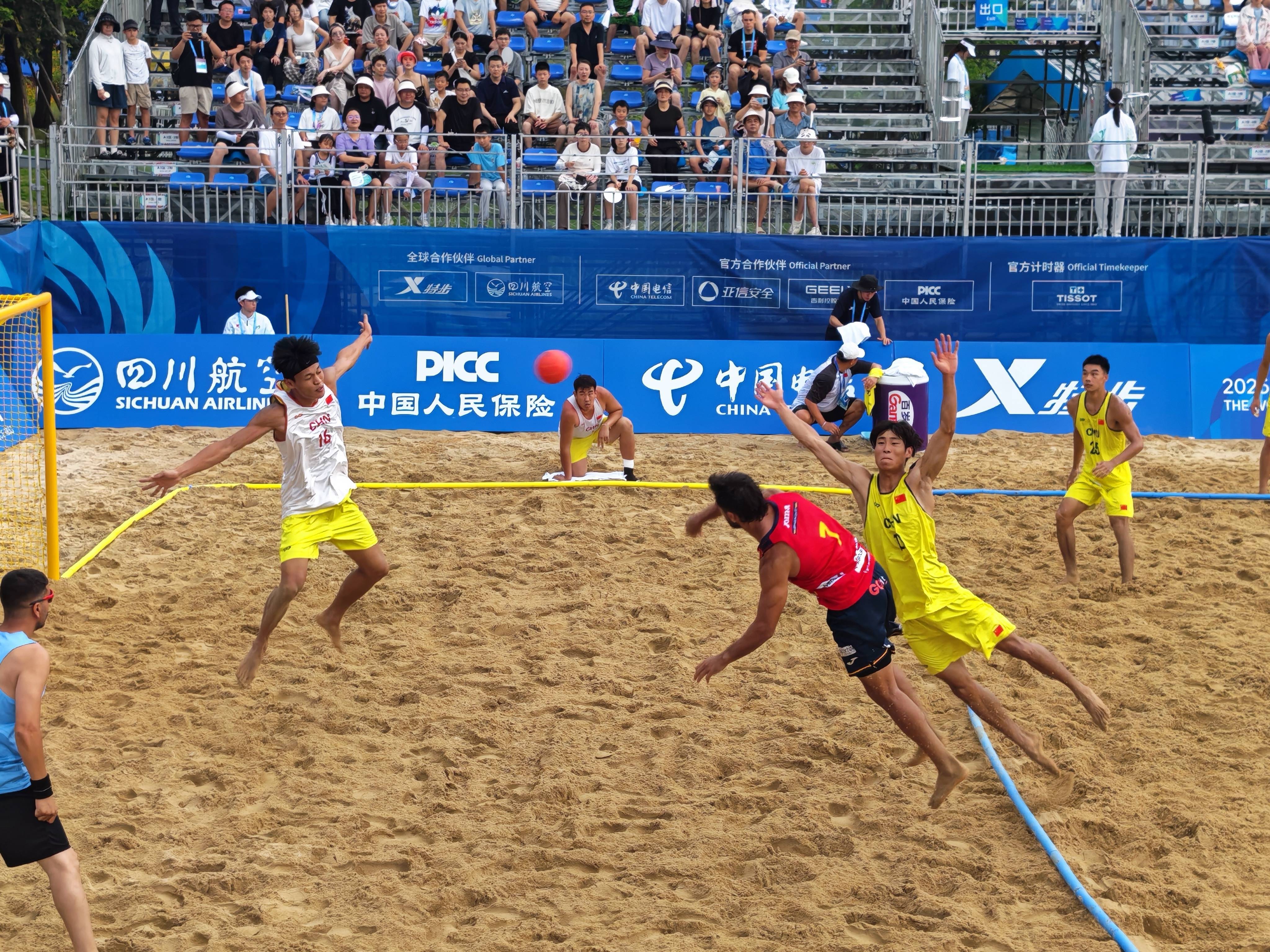 成齐世运会沙滩手球比赛现场。新华社记者 张武岳 摄成齐世运会的沙滩手球比赛阵势为长27米、宽12米的沙地,阵势两头设有高2米、宽3米的球门。比赛时每队4名球员(3名场上球员加1名守门员)上场,分为高下半场,每半场10分钟,中场休息5分钟。“沙滩相对松软,洞开员不易受伤,这种阵势合乎他们作念各式高难度当作。较之传统手球,沙滩手球的措施拘谨较少,洞开员在场上解放阐发的空间更大。再加上比赛中时时有音乐和证明,现场不雅赛成为一种独到的视听享受。”石磊说。