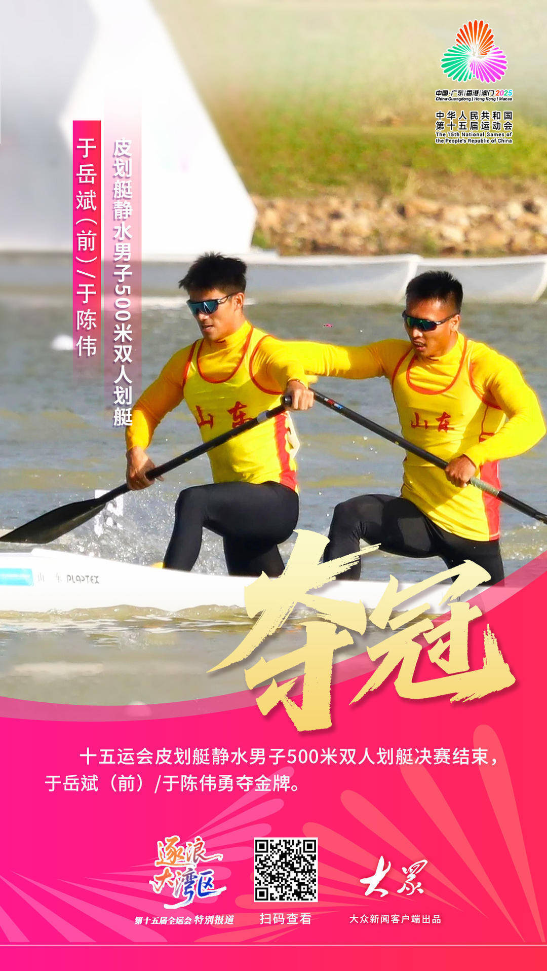 11月17日上昼,十五运会皮划艇静水须眉500米双东谈主划艇决赛界限,于岳斌、于陈伟勇夺冠军,为山东代表团再添一金。